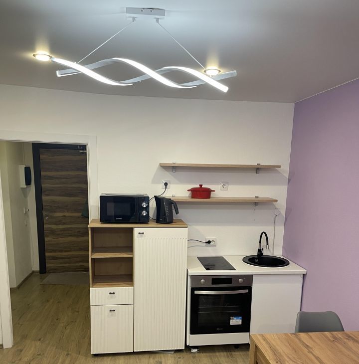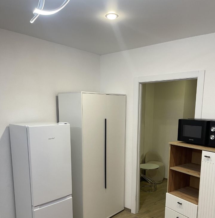 Кухня, свч, диван, телевизор, холодильник, стиральная машина, навесной комод и шкаф, фен и прочие принадлежности.