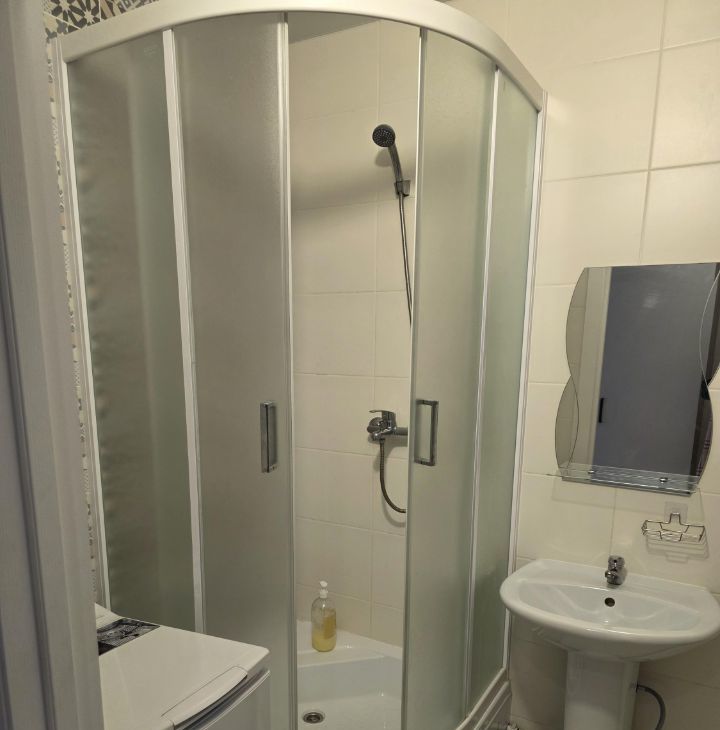 В апартаментах есть всё необходимое, включая стиральную машину и большой холодильник. Постельного белья и посуды нет.