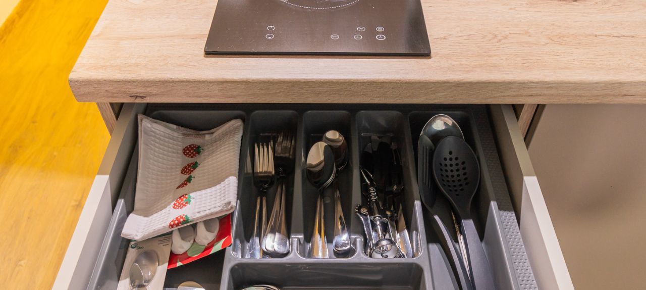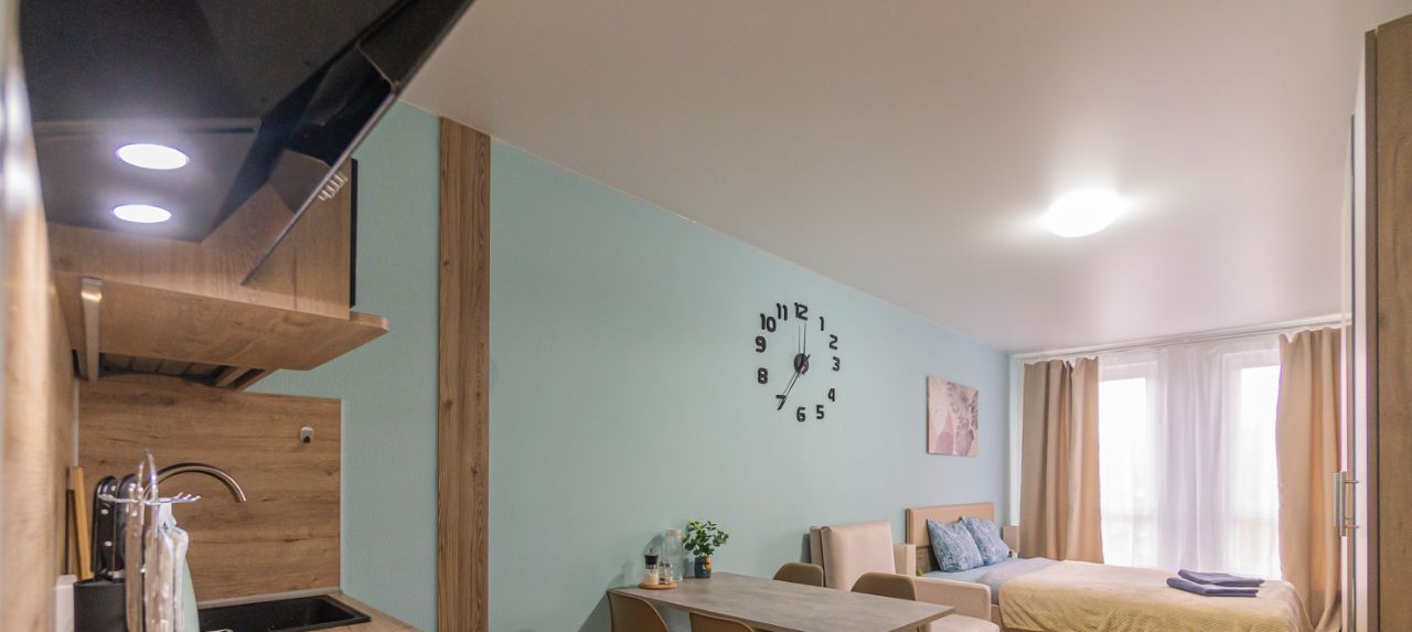 Спальня совмещена с кухонной и обеденной зоной.