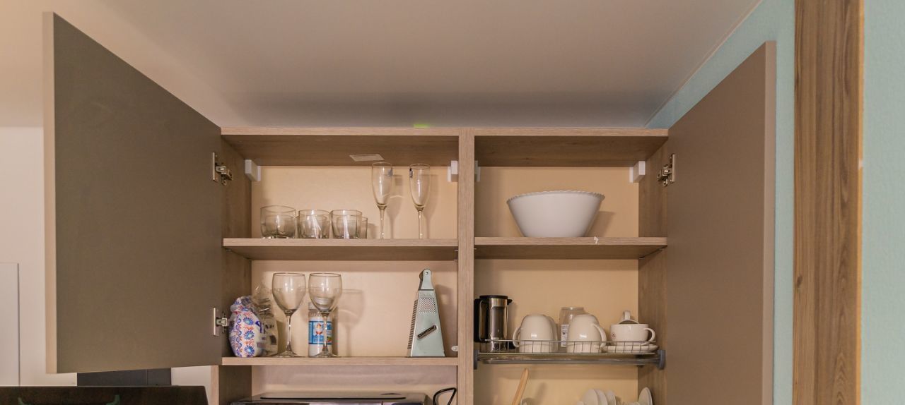 - обеденная зона (холодильник, чайник, микроволновка, плита, столовая группа, посуда на 2 персоны, стол со стульями)