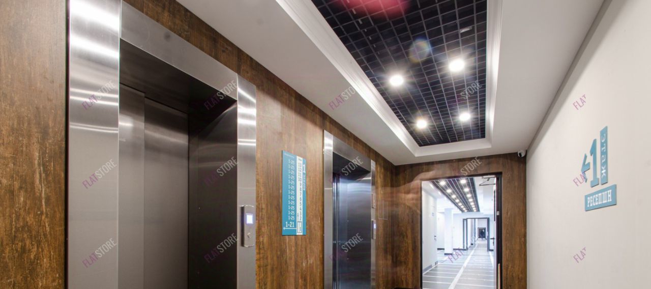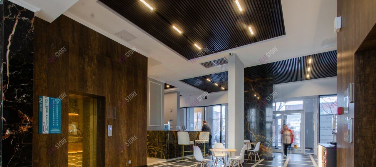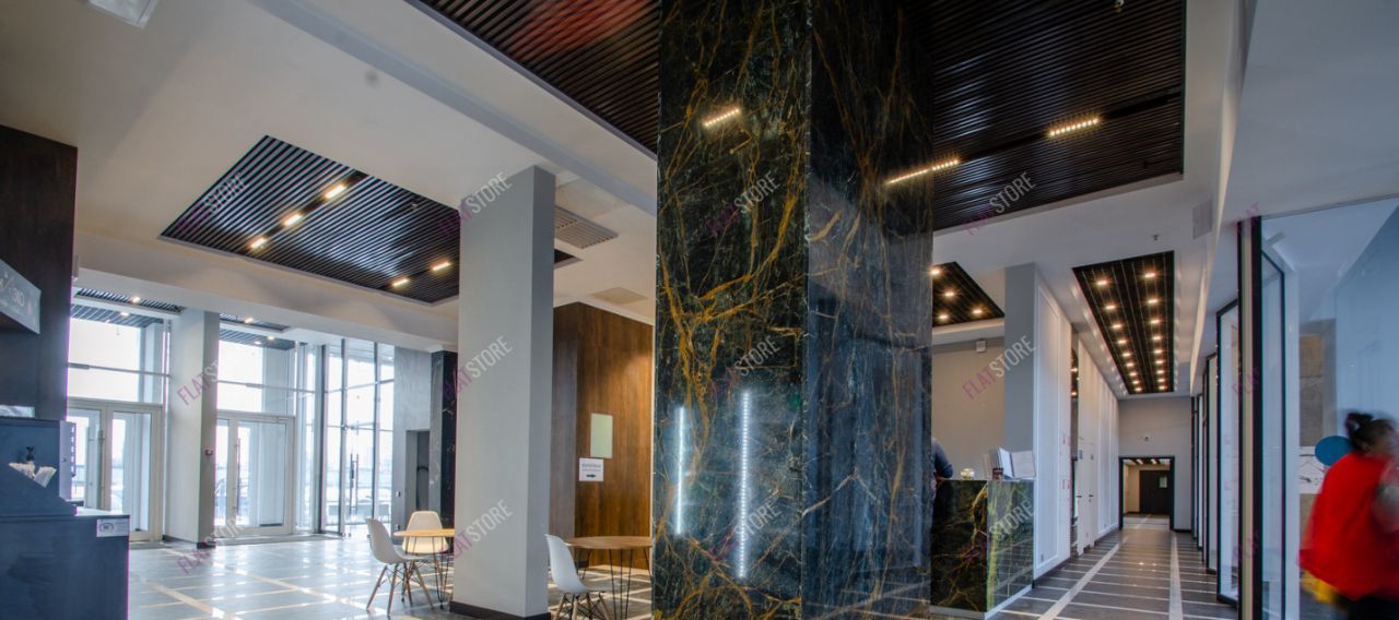 На первом этаже кафе, магазины. Большой современный холл с зоной рисепшн с посадочными местами для отдыха.