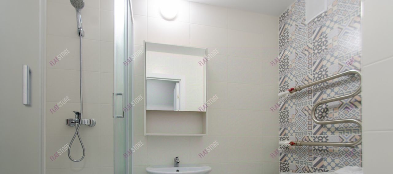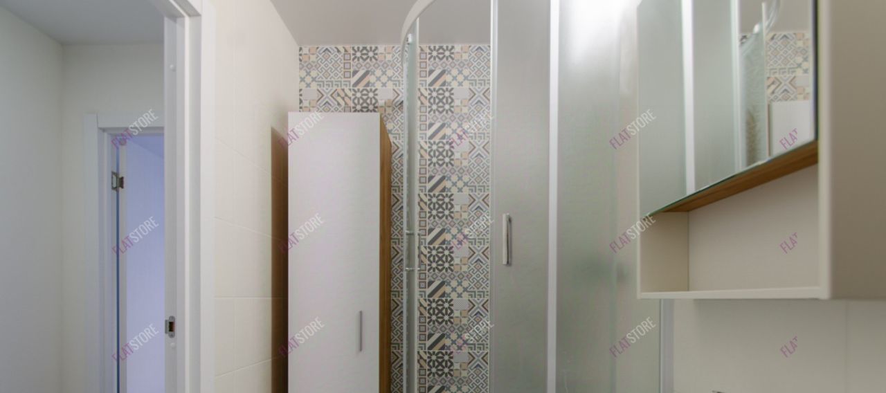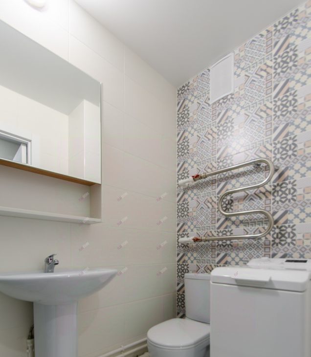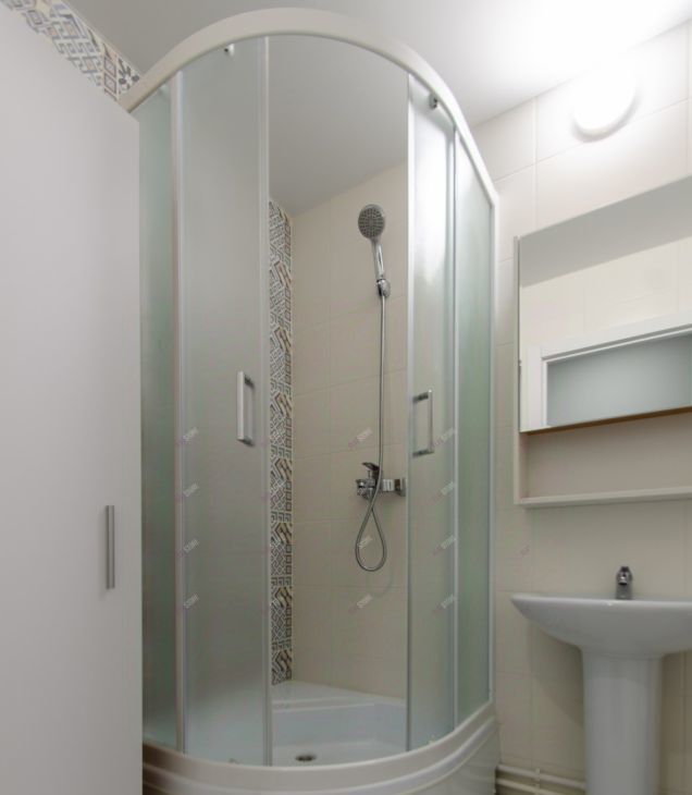 В санузле установлен шкаф, стиральная машина вертикальной загрузки, душевая кабина.