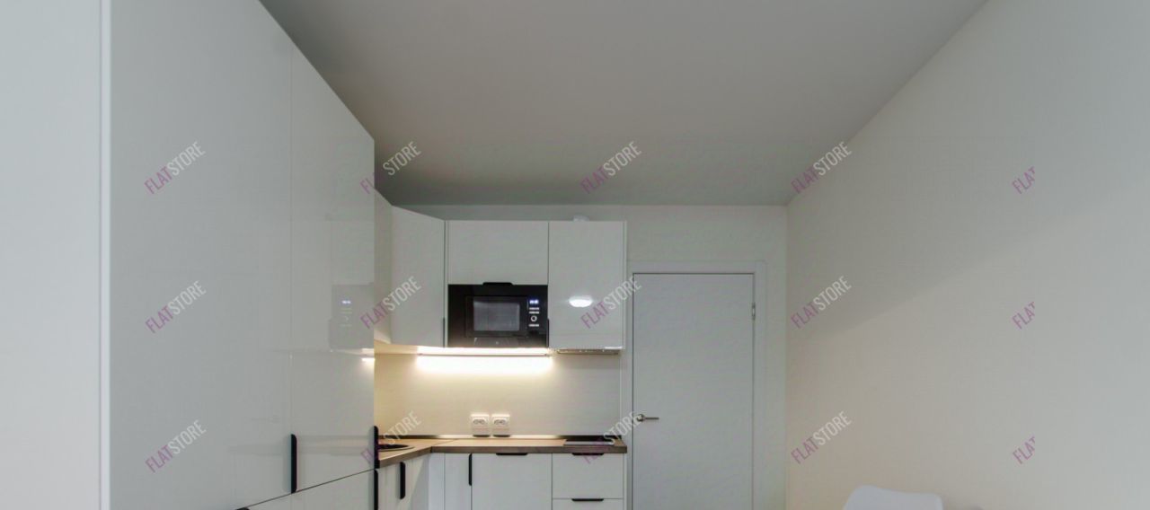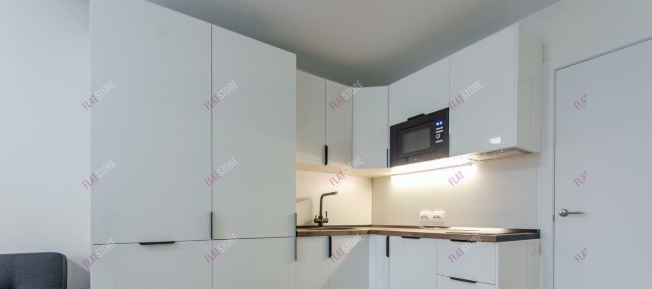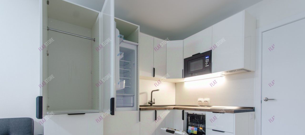 Установлена встроенная кухня. Из техники: варочная панель (индукционная), вытяжка, посудомоечная машина, микроволновая печь, встроенный холодильник.