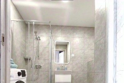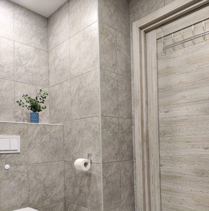 Просторный санузел отделан керамогранитом. Душевая кабина,