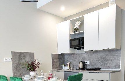 Кухонный гарнитур, холодильник, электрическая варочная панель, микроволновая печь, электро чайник. Необходимый набор столовых приборов, столовая и кухонная посуда.