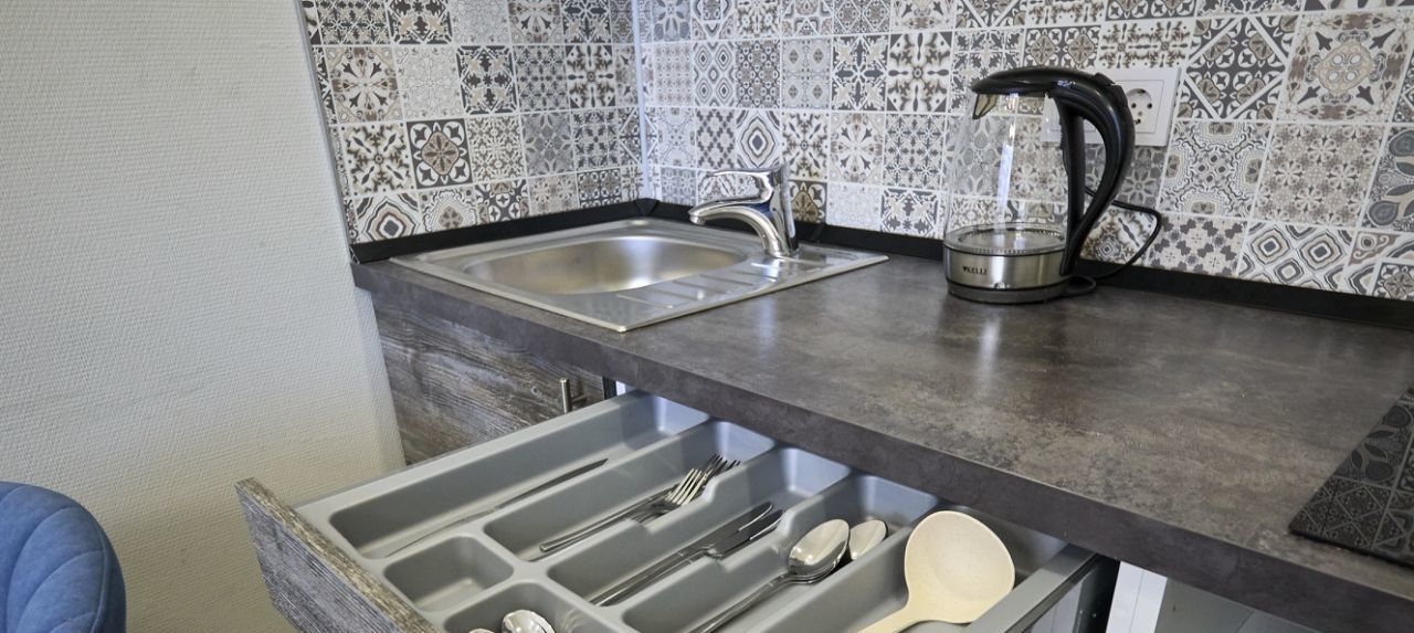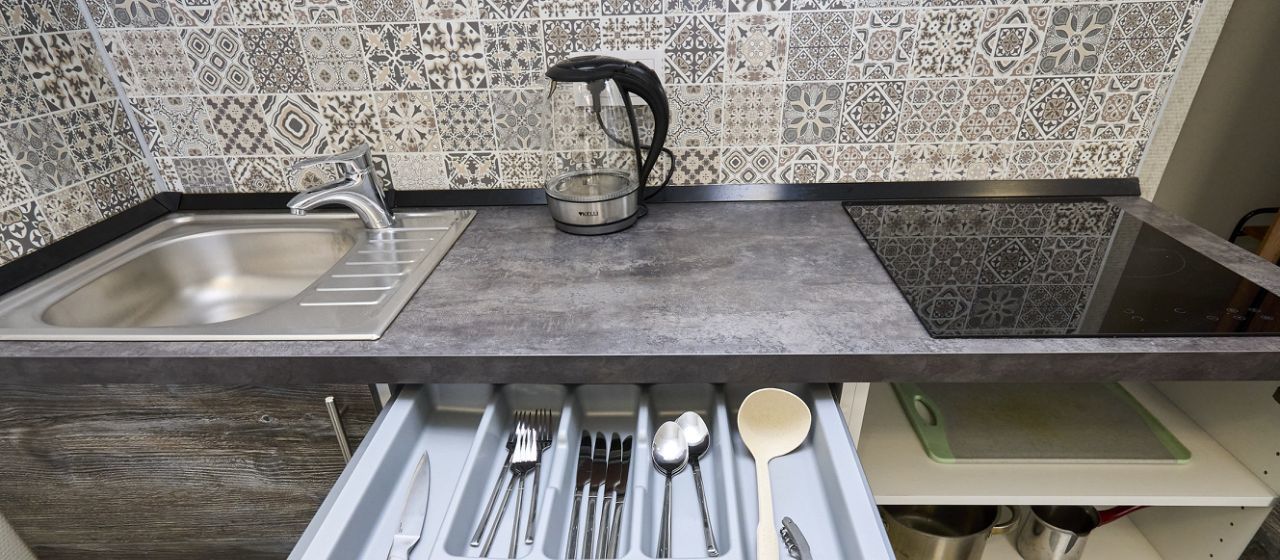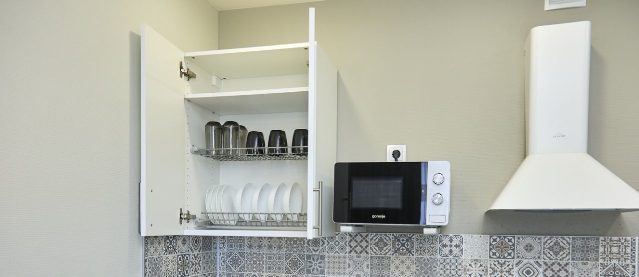 - кухонная техника (микроволновка, чайник, холодильник с морозилкой, большая варочная панель);