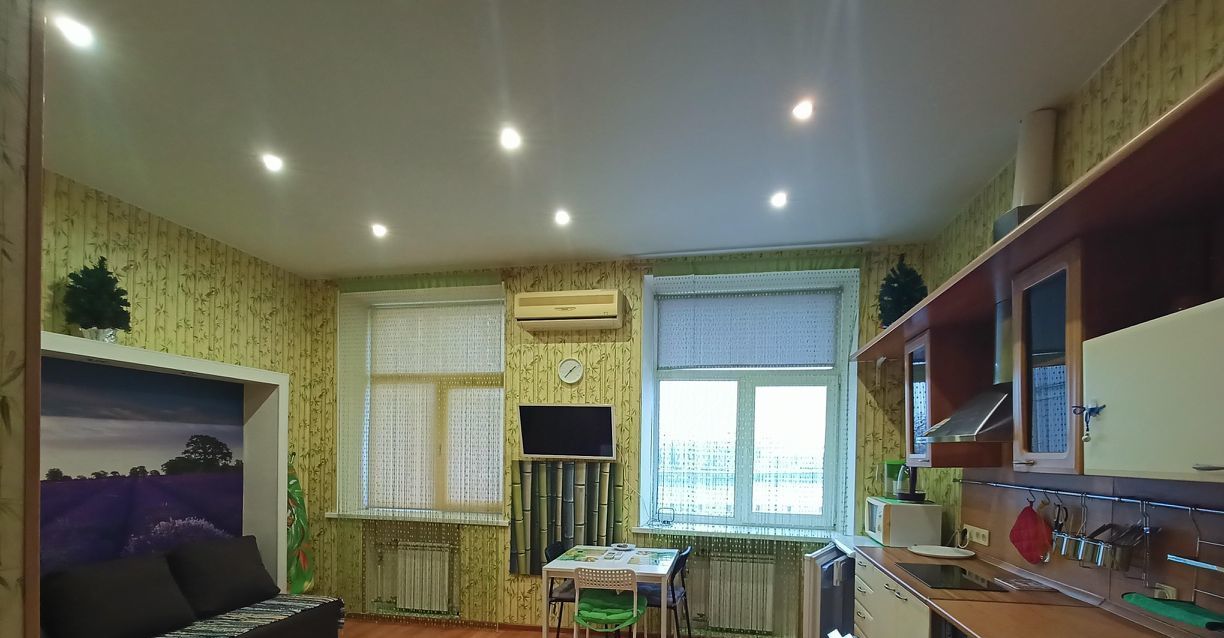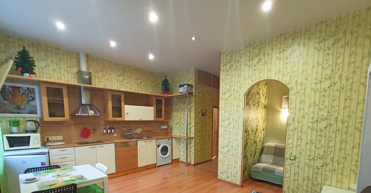 Просторная кухня гостиная площадью 31 м², с видом из окон на Гренадерский мост. Маленькая спальня- продуманный дизайн.. Есть все необходимое для комфортного прожив: мебель и бытовая техника, включая посудомоечную машину, стиральную машину, холодильник и т. д.