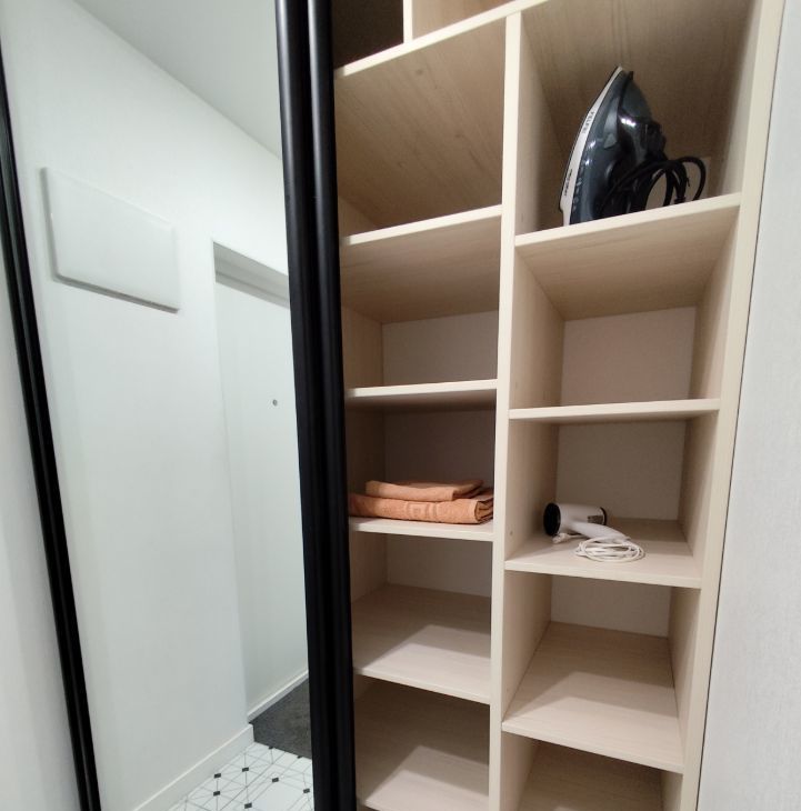 Много мест хранения: большой шкаф в прихожей, кровать с подъёмным механизмом и комод.