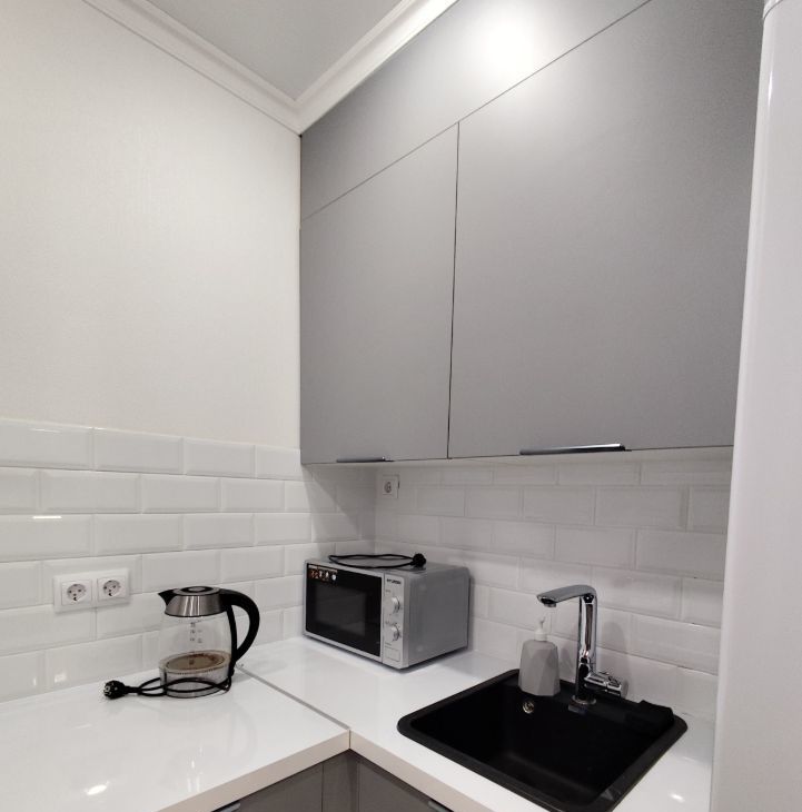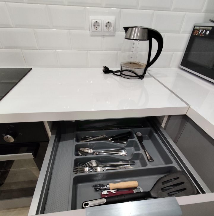 - Кухня оснащена холодильником, электрической плитой, духовкой, электрическим чайником, микроволновой печью, необходимым набором посуды (кружки, тарелки, ложки, вилки, ножи, кастрюля, сковорода)