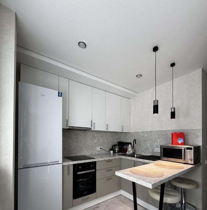 •Современная кухня с новой техникой (посудомойка, индукционная плита, духовка, холодильник, микроволновка)