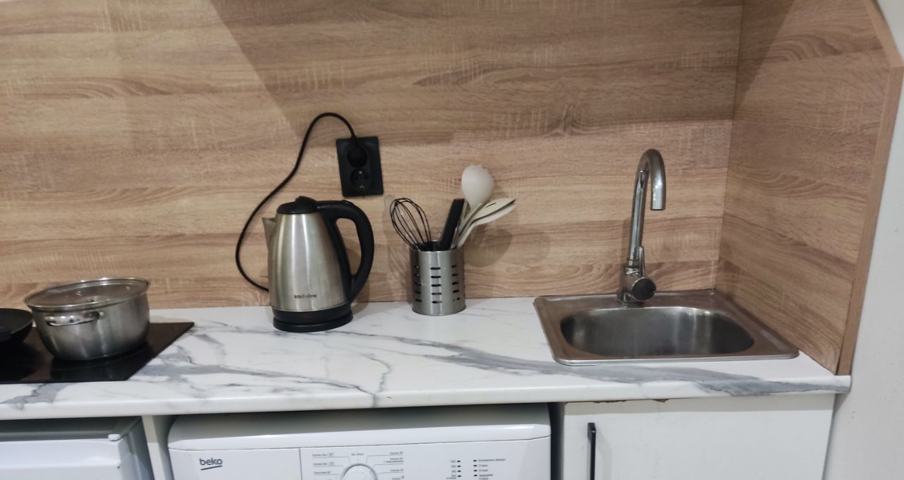 . Студия полностью укомплектована необходимой мебелью и техникой: есть холодильник, телевизор и стиральная машина.