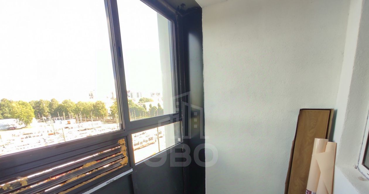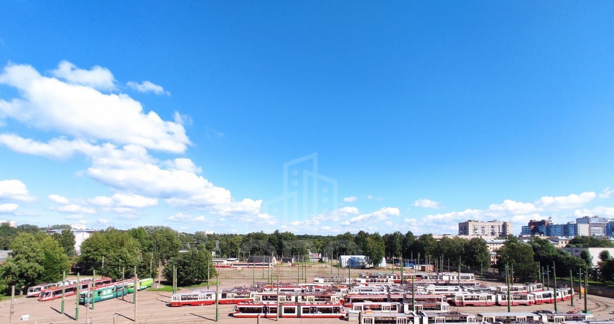 В студии очень светло: 2 окна и дверь с выходом на застекленный балкон. Вид из окон на трамвайный парк (см. фото).