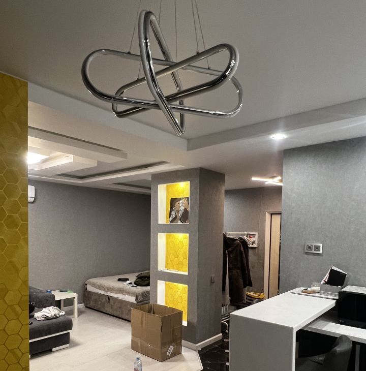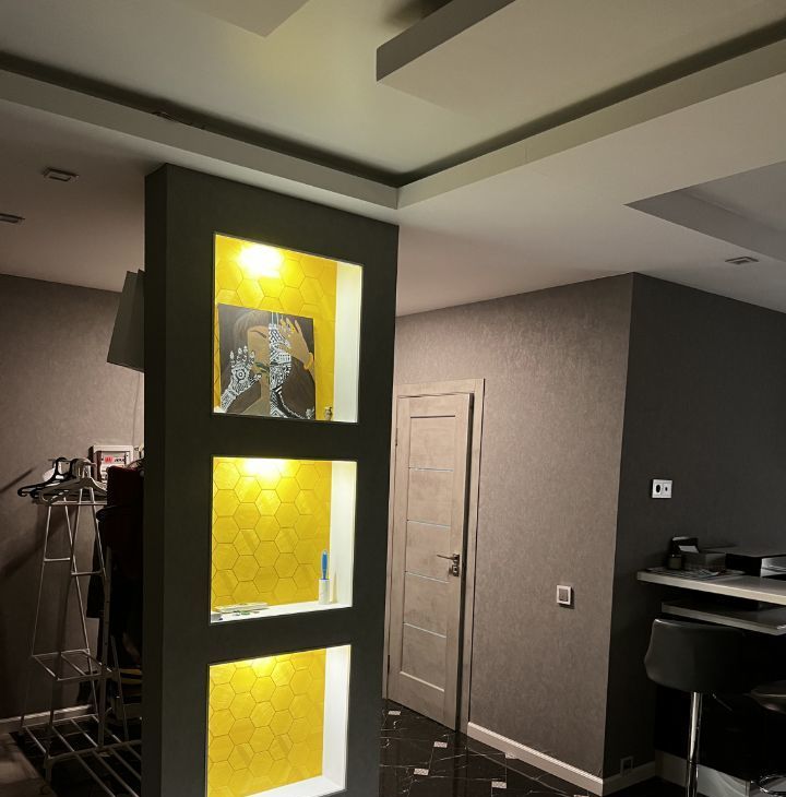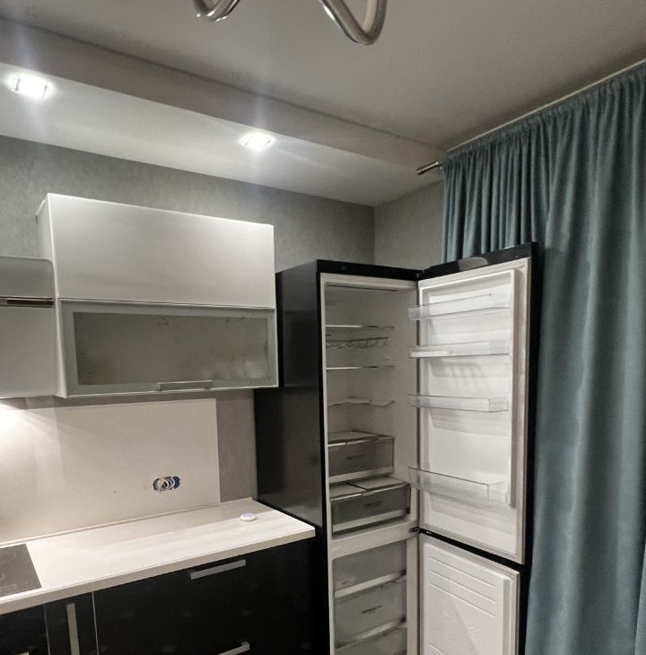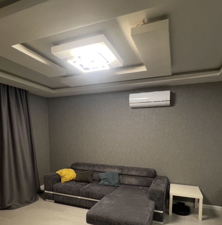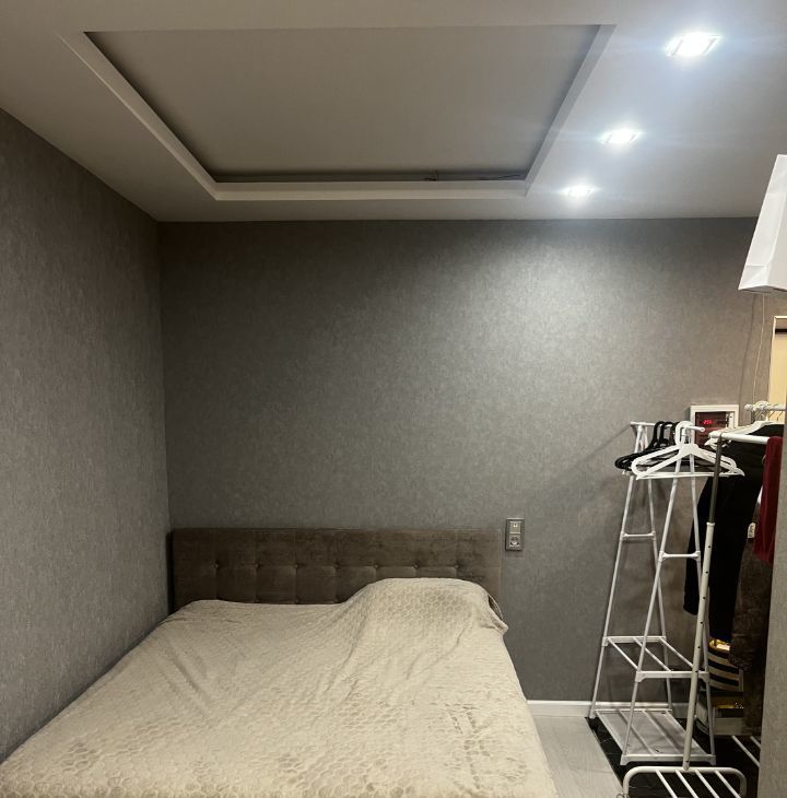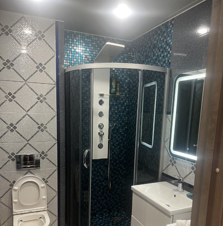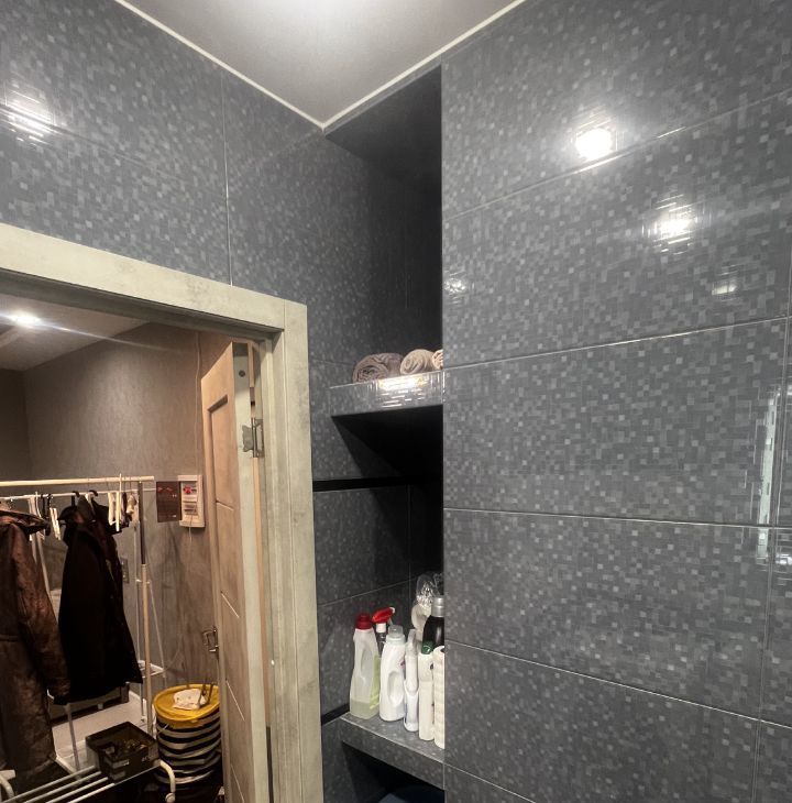 Санузел совмещенный, оборудован душевой зоной со стеклом, подвесным безободковым унитазом, раковиной с тумбой, стиральной машиной и полками для хранения. В основной комнате есть большой угловой диван (раскладывается в 2х2 метра), полноценная двуспальная кровать с высоким матрасам, шторы блэк-аут, имеется TV 50*(но работает только от интернет-приставки либо как экран), кондиционер. Абсолютно новый шкаф! во всю стену между входной дверью и перестенком с подсвеченными нишами уже заказан, и будет к 3.03.2026.
